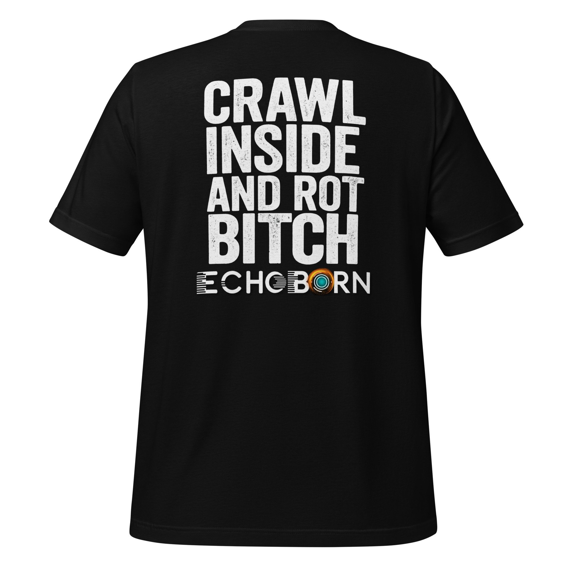 The grim reaper is front and center, hanging out by his favorite tombstone, and the back? Oh, the back is screaming: “CRAWL INSIDE AND ROT BITCH.” Mood? Absolute chaos.